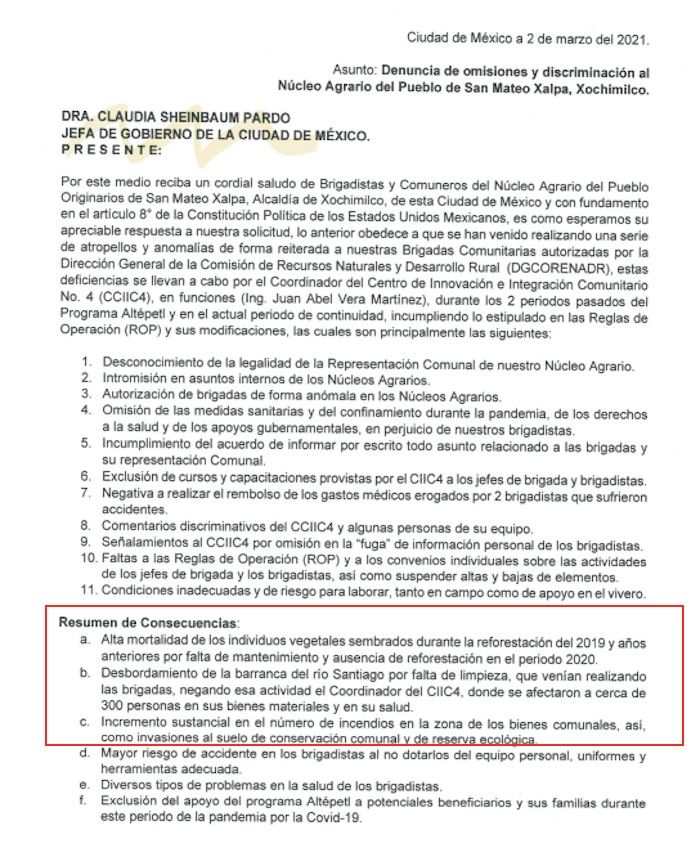 Para que la reforestación en uno de los pulmones de la capital continúe de forma adecuada, brigadistas del núcleo agrario del pueblo xochimilca han alertado las irregularidades y la suspensión del apoyo a la titular de la Comisión de Recursos Naturales y Desarrollo Rural (Corenadr) de la Secretaría de Medio Ambiente local, Columba López Gutiérrez, e incluso en persona a la Secretaria de Medio Ambiente, Marina Robles García.