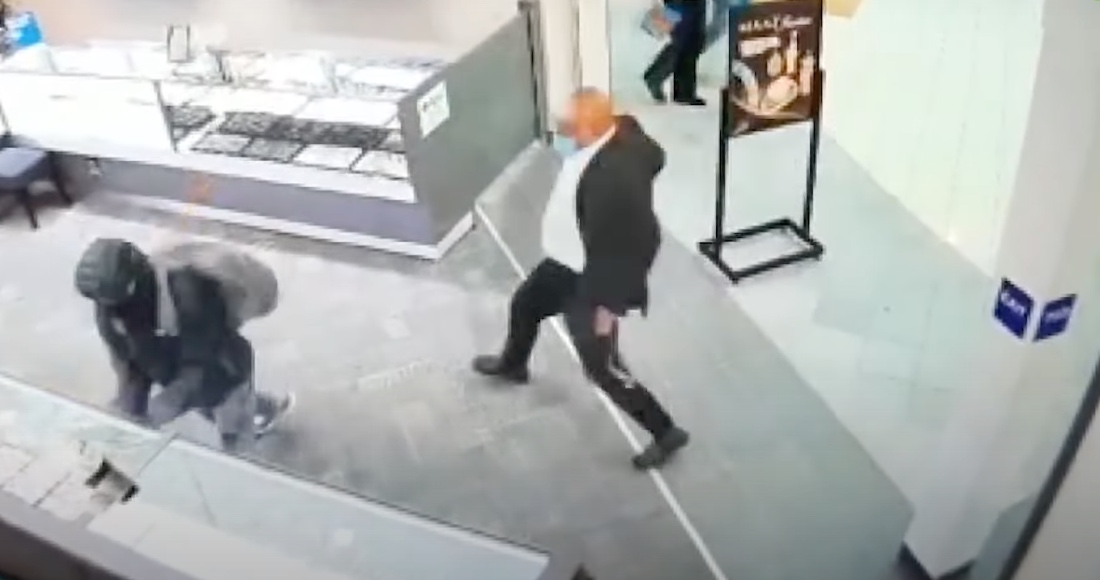 En la grabación, se observa cómo uno de los ladrones, que lleva un pasamontañas, irrumpe en la tienda y con una palanca golpea dos veces una de las vitrinas para romperla. Pero entonces, el propietario de la joyería le da un empujón y lo encañona, provocando que los delincuentes salgan corriendo.