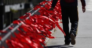 Lazos rojos con el objetivo por el Día Mundial de la Lucha contra el Sida, celebrado cada 1 de diciembre. Foto: Javier Lizón, EFE
