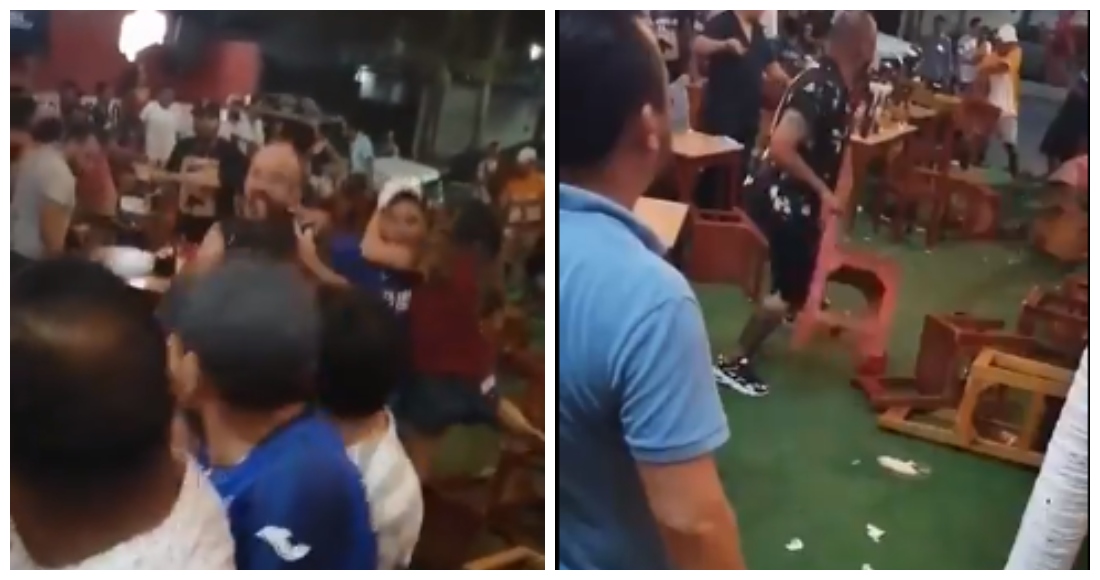 Los materiales muestran cómo los asistentes se empujan unos con otros, mientras que hay quienes intentan separarlos. Sin embargo, uno de ellos se dirige directamente contra una persona y lo golpea, momento en el cual todos los aficionados provocan destrozos de vasos y tiran mesas del lugar. Igualmente es en ese momento en el que el personal de seguridad del bar interviene.