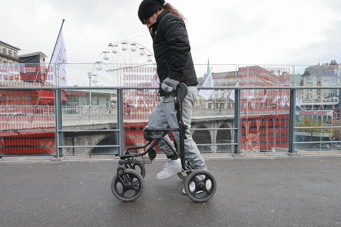 En un video facilitado por el EPFL se ve al paciente mostrando cómo funciona este sistema: una presión sobre el botón del lado derecho de su andador más su voluntad de activar sus músculos hacen posible que su pierna izquierda se flexione y luego se pose unos centímetros más adelante. Al activar el botón de la izquierda es la pierna derecha la que a su turno da un paso y así empieza a caminar.