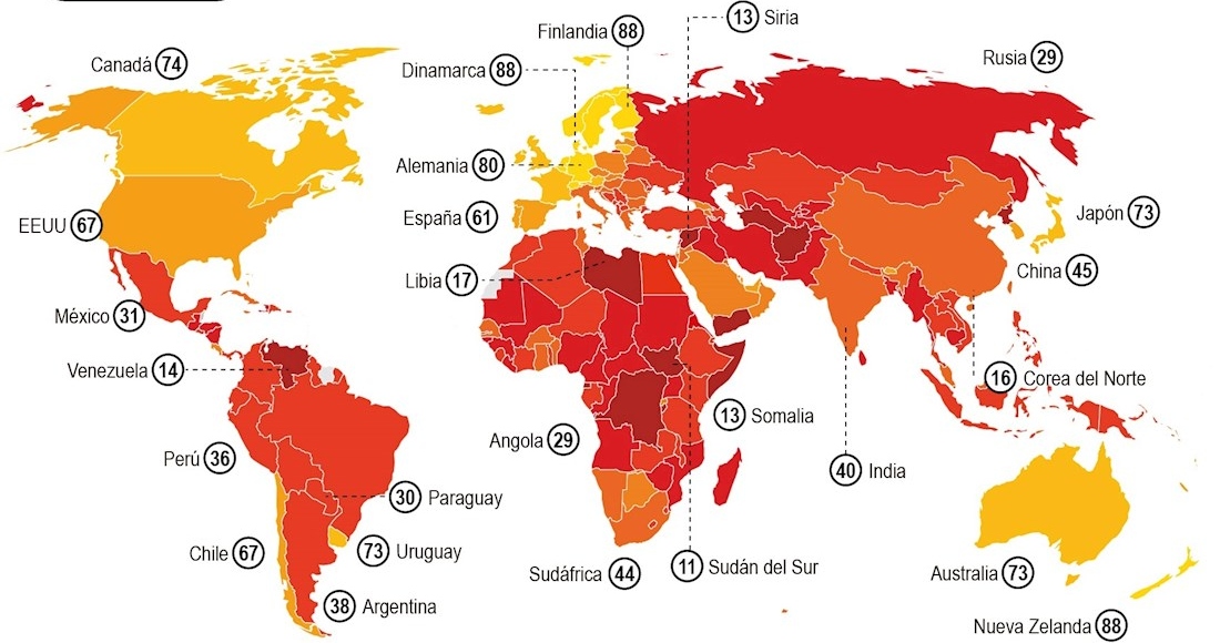 Solo tres países latinoamericanos obtuvieron puntajes por encima de 50: Uruguay, Chile y Costa Rica.