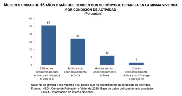 Por más de la mitad, el 51 por ciento, de las mujeres de 15 años o más unidas que vivían con su cónyuge o pareja en la misma vivienda, dijo ser no económicamente activa (13 millones), pero su pareja sí lo es. Si bien esta situación prevalece, el trabajo doméstico no remunerado y la crianza de los hijos es una actividad fundamental para el desarrollo de los integrantes del hogar.