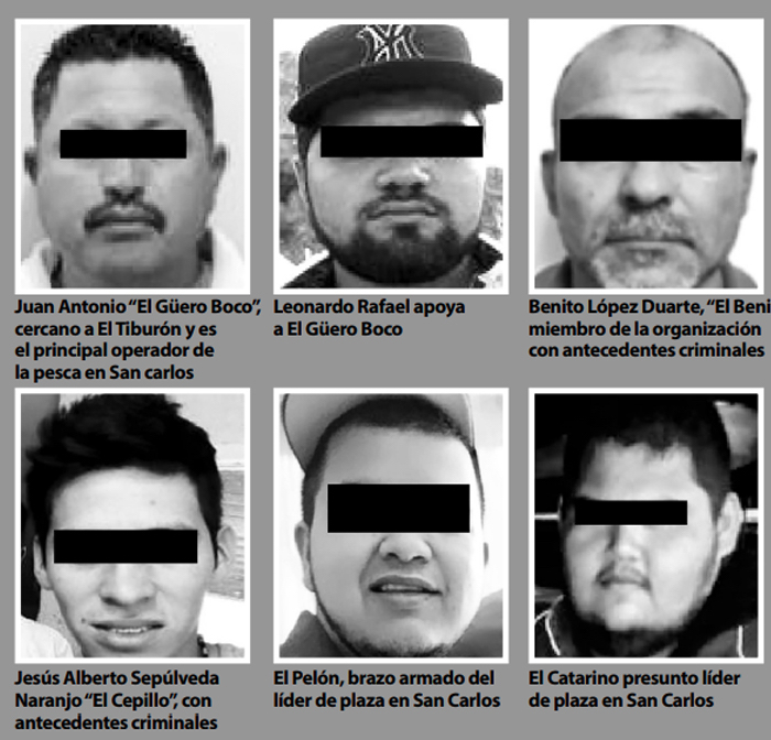 Elementos de Seguridad Pública filtraron la estructura criminal que opera el guaterismo en la comunidad, encabezada por Juan Antonio alias “El Güero Boco” vinculado directamente a “El Tiburón”. Le apoyan Leonardo Rafael, Benito López Duarte “El Beni”, Jesús Alberto Sepúlveda Naranjo “El Cepillo”; además de “El Catarino” -jefe de plaza en San Carlos- y su pistolero, de apodo “El Pelón”.