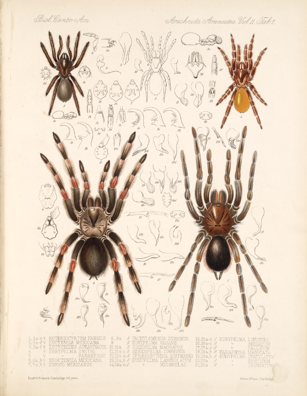 Una página del estudio Arachnida – Araneida and Opiliones (1897), de Frederick Octavius Pickard-Cambridge, en el que aparece la araña bajo el nombre de Eurypelma pallidum. Foto: vía Raichalí.