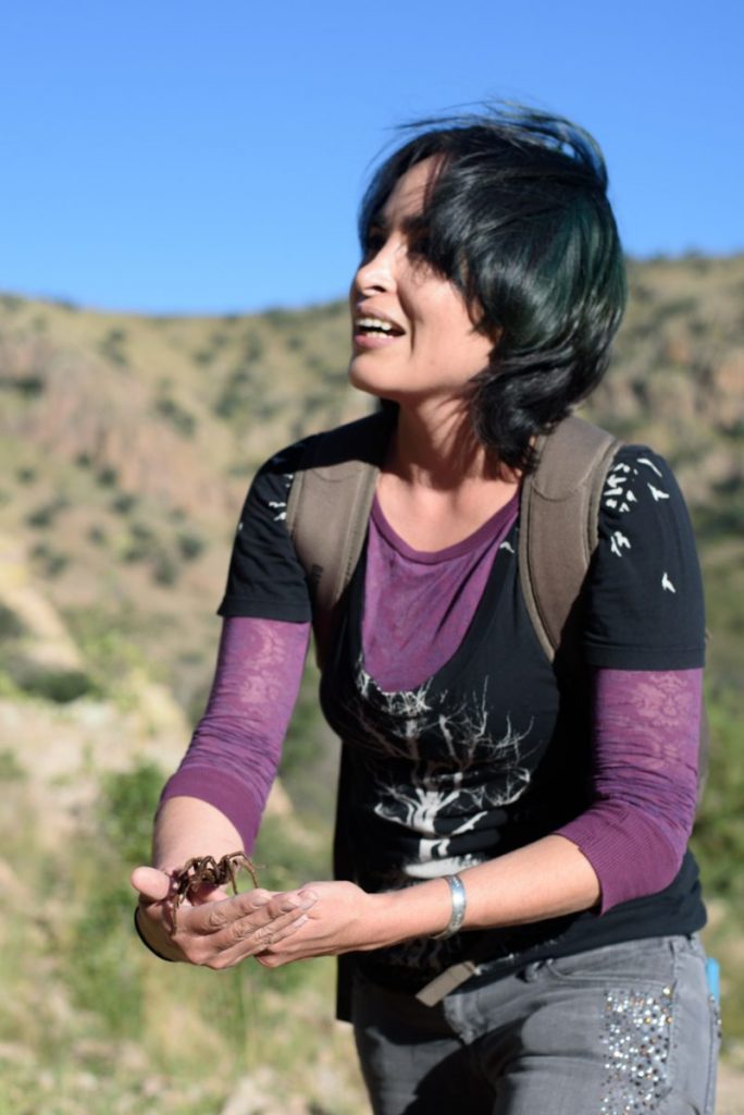 Alejandra con una Aphonopelma pallidum macho, al norte del municipio de Chihuahua. Foto: Raúl Fernando Pérez Lira vía Raichalí.
