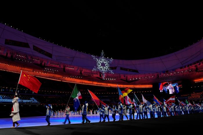 El paseo de las banderas durante la ceremonia de clasura de los Juegos Olímpicos de Invierno de Beijing, el domingo 20 de febrero de 2022. Foto: AP