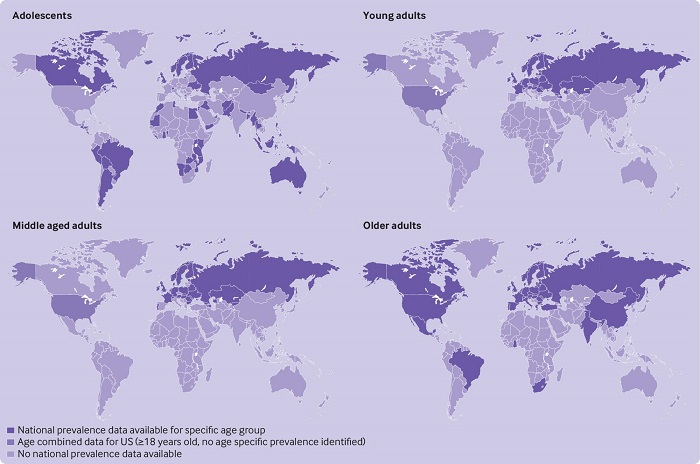 Se disponía de datos sobre los adolescentes (12-17 años) en 77 países o territorios, adultos jóvenes (18-29 años) en 30 países, adultos de mediana edad (30-59 años) en 32 países y adultos mayores (60 años o más) en 40 países. La cobertura de datos fue notablemente mayor en los países de renta alta (especialmente en Europa) en comparación con los países de renta baja y media.