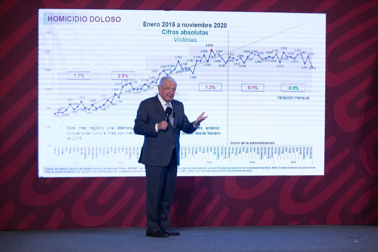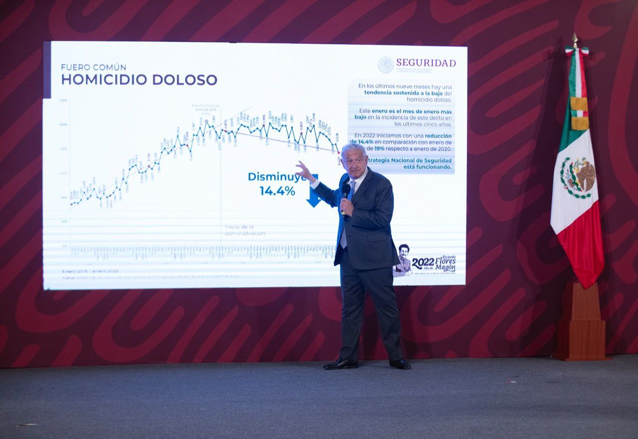 Explicó que del promedio diario de 93 homicidios dolosos en enero de 2019, durante el primer mes de 2022 se promediaron 79, lo que supone una sustancial caída de los asesinatos.