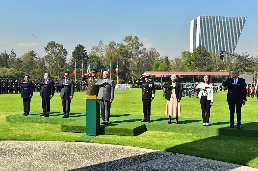 AMLO presidió la ceremonia conmemorativa del Día de la Bandera en el Campo Deportivo Militar Marte, en la Ciudad de México, donde contó con la presencia del Ejército, de la Marina y personal de su Gabinete.
