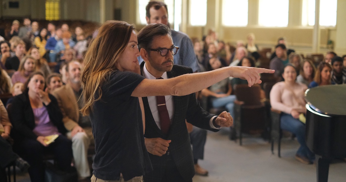 Estaba acompañada por sus compañeros Troy Kotsur, Emilia Jones, Daniel Durant y el actor mexicano Eugenio Derbez, quien interpreta al profesor de música del personaje de Jones, la única integrante de la familia que puede oír.