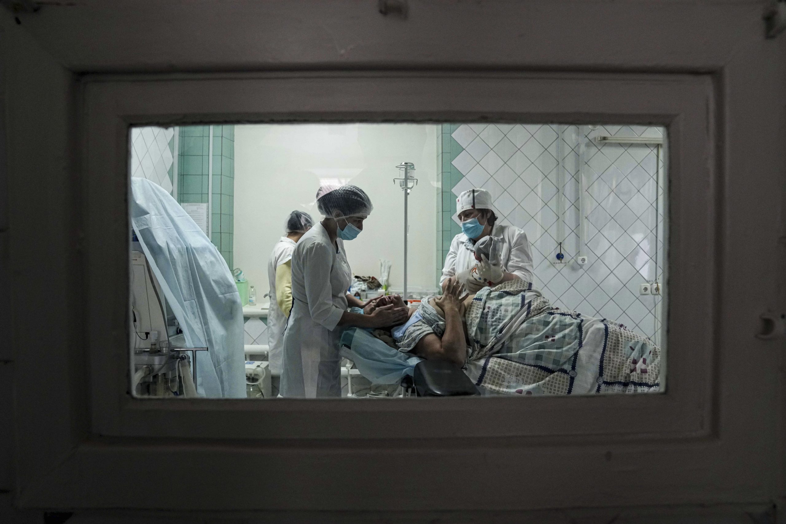Las víctimas de los bombardeos llegaban a la maternidad de la ciudad, incluyendo el cuerpo de un joven en una camilla.