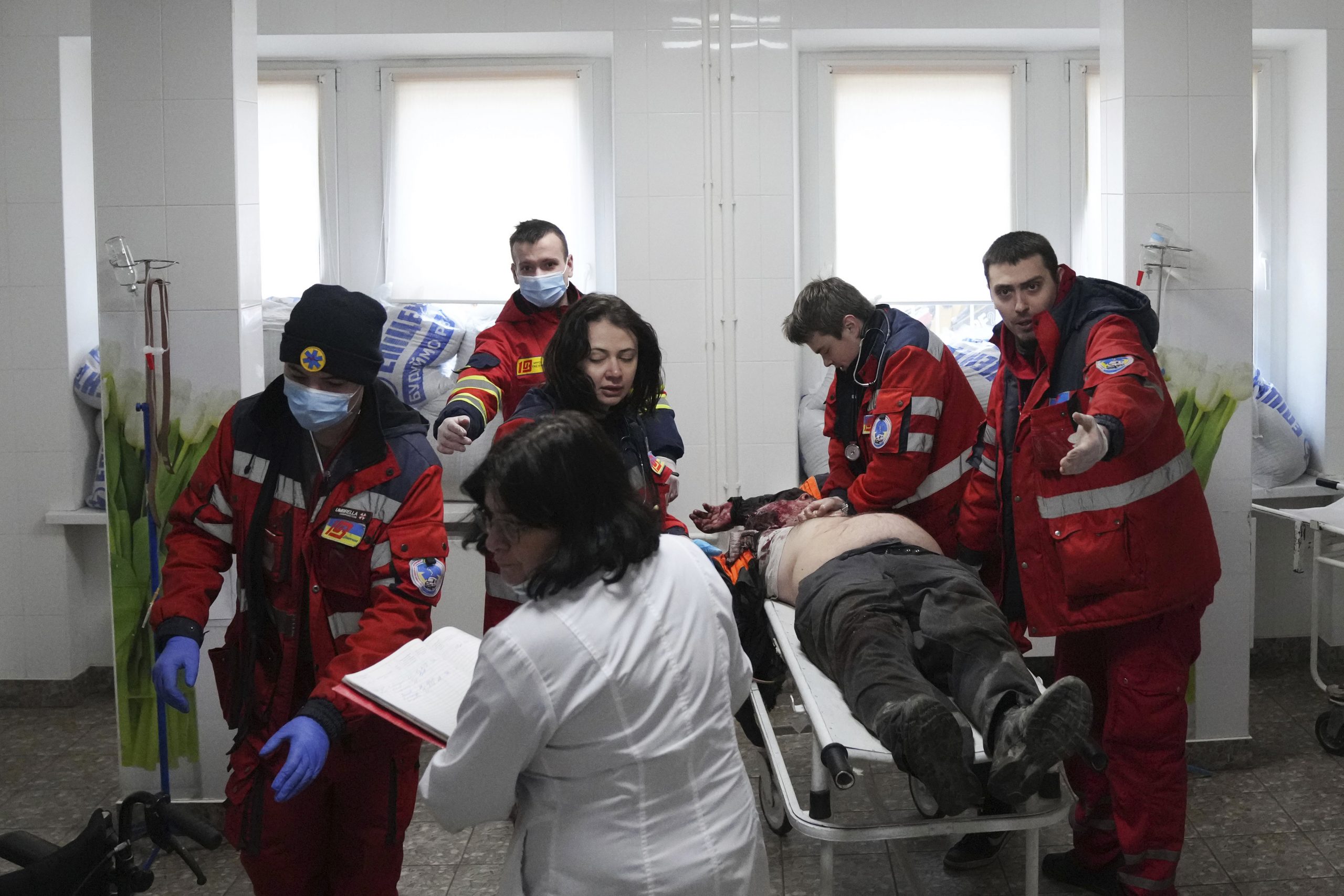 Otra mujer, que sangraba por la boca, gritaba de dolor mientras era atendida. Los profesionales médicos operaron a otros heridos durante el bombardeo, y los médicos trasladaron a un hombre desde una ambulancia a una camilla para que pudiese ser tratado.