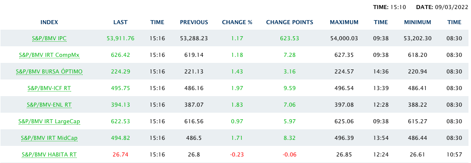 Ciudad de México, 9 de marzo (EFE).– La Bolsa Mexicana de Valores (BMV) avanzó este miércoles un 1.17 por ciento en su principal indicador, hasta llegar a los 53 mil 911.76 puntos, un comportamiento en línea con el resto de los mercados.