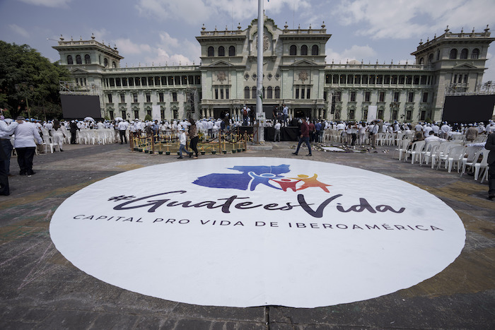 Una pancarta se encuentra afuera del Palacio Nacional durante un evento que celebra una nueva ley denominada "Ley para la Protección de la Vida y la Familia" en la Ciudad de Guatemala, el miércoles 9 de marzo de 2022. Foto: Moisés Castillo, AP.