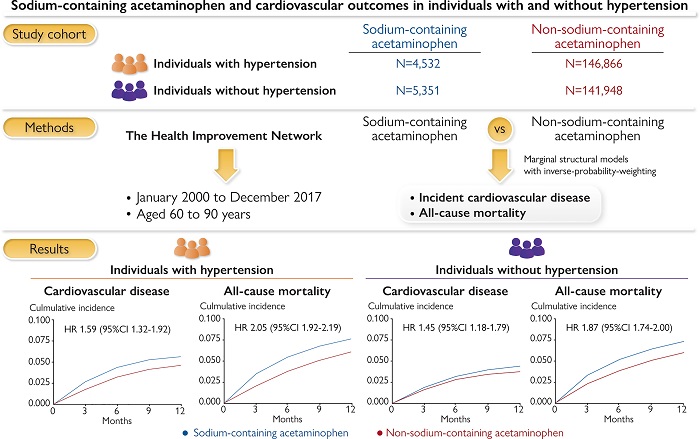 El paracetamol que contiene sodio se asoció con un mayor riesgo de ECV y mortalidad por todas las causas entre las personas con o sin hipertensión. Las personas deben evitar la ingesta innecesaria de paracetamol que contiene sodio.
