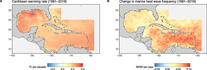 Patrones de calentamiento en todo el mar Caribe. Foto: Colleen B. Bove et al., A century of warming on Caribbean reefs, Plos Climate, marzo 2022