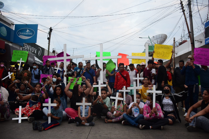 Portando pancartas y cruces, los migrantes marcharon desde un parque de la localidad, donde al menos un millar de ellos llevan semanas e incluso meses varados, y llegaron hasta las afueras de la estación militar donde el mandatario mexicano ofrecía su tradicional rueda de prensa diaria.
