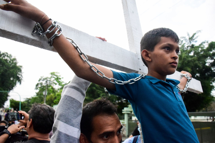 Encadenad@s a cruces y cociéndose los labios, así es como protestan un grupo de migrantes afuera de donde se está llevando a cabo la #mañanera en #Chiapas. pic.twitter.com/D52lCj6Z9v