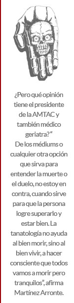 ¿Pero qué opinión tiene el presidente de la AMTAC y también médico geriatra? “De los médiums o cualquier otra opción que sirva para entender la muerte o el duelo, no estoy en contra, cuando sirve para que la persona logre superarlo y estar bien. La tanatología no ayuda al bien morir, sino al bien vivir, a hacer consciente que todos vamos a morir pero tranquilos”, afirma Martínez Arronte.