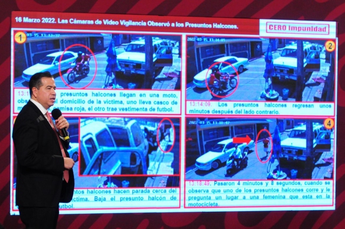Apoyado con imágenes, el funcionario explicó la cronología de los hechos. En ellas se ve que primero dos "halcones" (informantes del crimen organizado) observaron el domicilio de la víctima mientras iban en moto. Incluso, uno de ellos se entrevistó con vecinos.