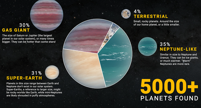 Los más de 5 mil planetas encontrados hasta ahora incluyen pequeños mundos rocosos como la Tierra, gigantes gaseosos muchas veces mayores que Júpiter y "Júpiter calientes" en órbitas abrasadoramente cercanas alrededor de sus estrellas, recordó la NASA.