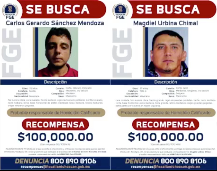 Los hombres fueron identificados como Carlos Gerardo Sánchez Mendoza y Magdiel Urbina Chimal de 21 y 39 años de edad, y la Fiscalía ofreció hasta 100 mil pesos como recompensa por aportar datos para su localización y detención.
