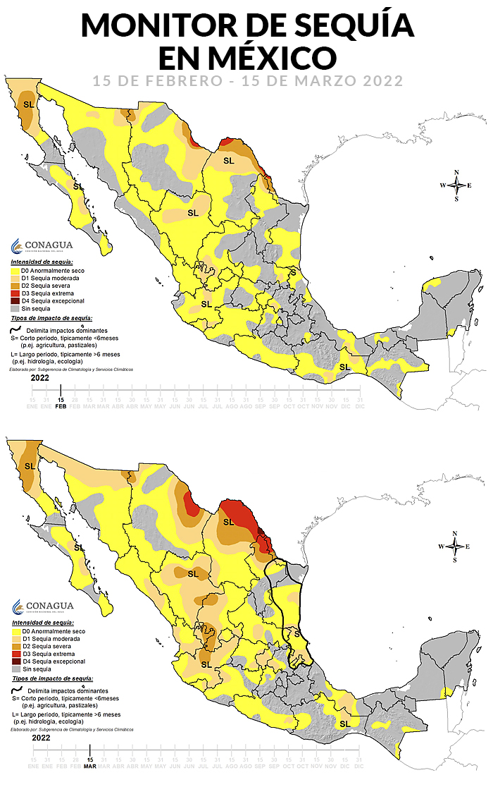 La sequía extrema ya se registra en el área norte de Coahuila (20.4 por ciento), Tamaulipas (3.4 por ciento) y Nuevo León (9.3 por ciento), entidad que está recortando el suministro —a excepción de a la industria que cuenta con pozos concesionados— porque sus dos principales presas llegaron al día cero, como informó SinEmbargo previamente. El Gobernador Samuel García también se reunió esta semana con el Presidente Andrés Manuel López Obrador por el estrés hídrico.