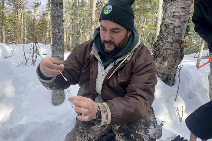 E.J. Isaac, biólogo de peces y vida silvestre de Grand Portage Band of Lake Superior Chippewa, toma una muestra de coronavirus en un ciervo joven en Grand Portage, Minnesota, el 2 de marzo de 2022. Foto: Laura Ungar, AP
