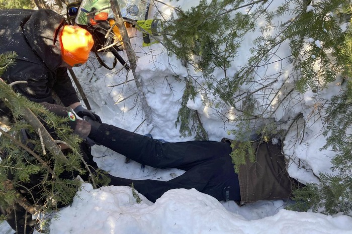 Todd Kautz, investigador posdoctoral de la Universidad Estatal de Nueva York, se acuesta boca abajo para tomar muestras biológicas de un oso en hibernación en su guarida mientras un colega lo sostiene de los pies. Las muestras incluyen una prueba de COVID para el joven oso negro. Foto: Laura Ungar, AP