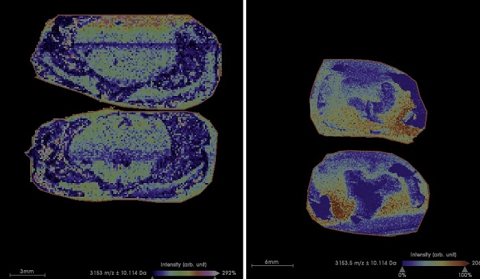 La imagen de la izquierda muestra los cerebros de ratones que no consumieron diacetilo. El de la derecha, en cambio, muestra los cerebros de los animales que ingirieron el compuesto, lo que indica una fuerte presencia de moléculas asociadas con el Alzheimer (puntos rojos). Foto: Lucas Ximenes
