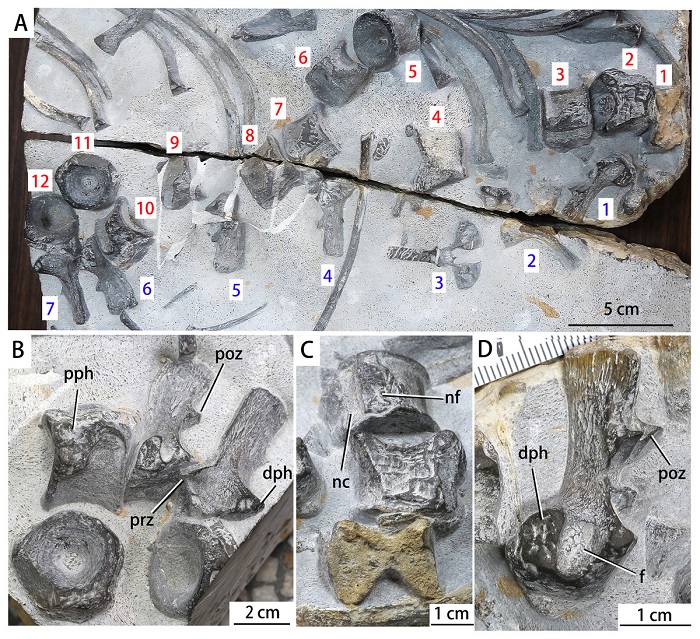 El fósil comprende solo la parte frontal del esqueleto del tronco, incluidas algunas vértebras y costillas, un hueso de la extremidad y huesos abdominales llamados gastralia, informa Xinhua.