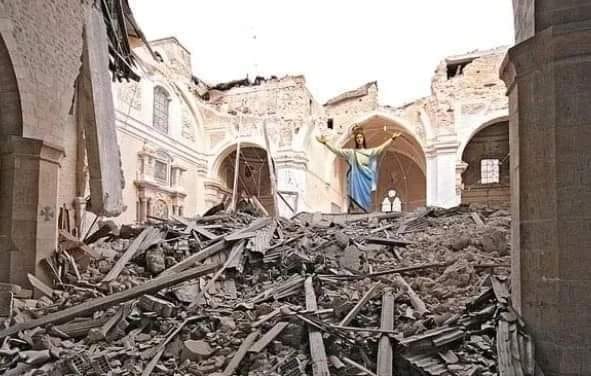 “Una iglesia en Ucrania totalmente destruida, solo quedó intacta la imagen de Cristo resucitado. Si estos no son signos de los tiempos entonces ¿qué son? Es ese Cristo resucitado de esos escombros un signo de esperanza. Podrán destruir templos pero la fe jamás”, dice erróneamente un texto con la imagen de la iglesia.