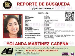 El pasado 9 de mayo, la Fiscalía confirmó que el cuerpo hallado el domingo pasado en el municipio de Juárez es el de Yolanda Martínez Cadena, la mujer de 26 años que desapareció el 31 de marzo en la colonia Constituyentes de Querétaro tercer sector, en San Nicolás de los Garza.