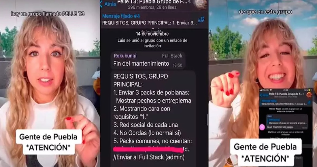 Por ejemplo, en un grupo titulado “Packsss” se puede ver un mensaje automatizado que lee: “Si quieres entrar a un grupo exclusivo OnlyFans filtrados y aportes 100 por ciento caseros de mexicanas tienes que cumplir con los siguientes requisitos en los próximos cinco minutos”.