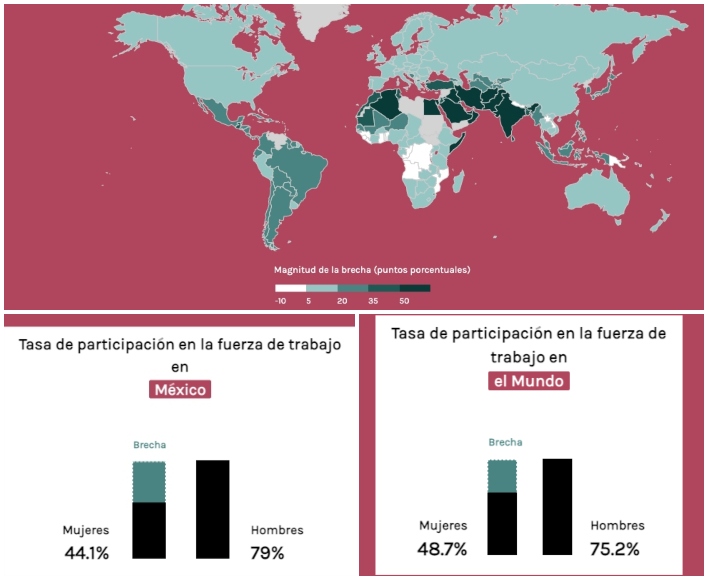 De acuerdo con un reporte de la Organización Internacional del Trabajo (OIT), hasta 2018 México tenía una diferencia porcentual de casi 35 puntos porcentuales en su brecha laboral por cuestiones de género –con sólo el 44.1 por ciento activo del total de mujeres en edad de trabajar, frente a un 79 por ciento de los hombres en la misma condición–.