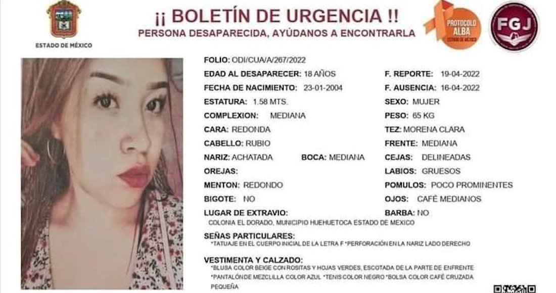 De acuerdo con el boletín recibido por la Fiscalía General de Justicia de la Ciudad de México (FGJ-CdMx), llevaba una sudadera rosa, una playera tipo ombliguera blanca, pantalón de mezclilla azul y tenis blancos con tres franjas doradas marca Adidas.