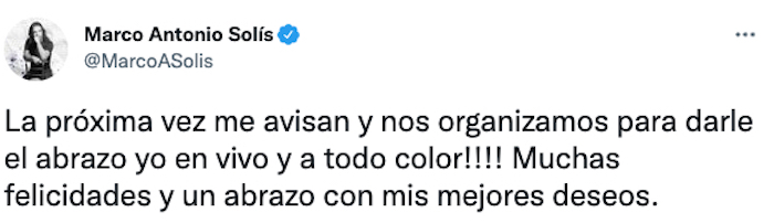 “La próxima vez me avisan y nos organizamos para darle el abrazo yo en vivo y a todo color!!!! Muchas felicidades y un abrazo con mis mejores deseos", escribió Marco Antonio Solís en Twitter.