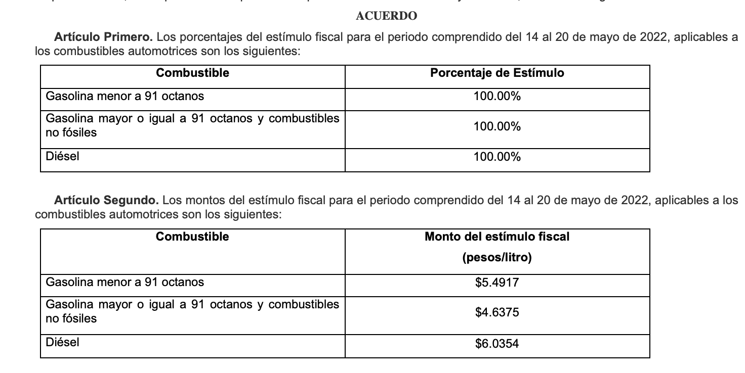 De acuerdo con lo publicado en el primer artículo del acuerdo, los porcentajes del estímulo fiscal serán del 100 por ciento para las gasolinas menores a 91 octanos, mayores a 91 octanos y diésel. Asimismo, en el segundo artículo se estipulan los montos para cada una de las gasolinas: para la primera, el monto será de 5.4917 pesos el litro; para la segunda, habrá un estímulo fiscal de 4.6375 pesos; mientras que para el diésel, será de 6.0354 pesos.