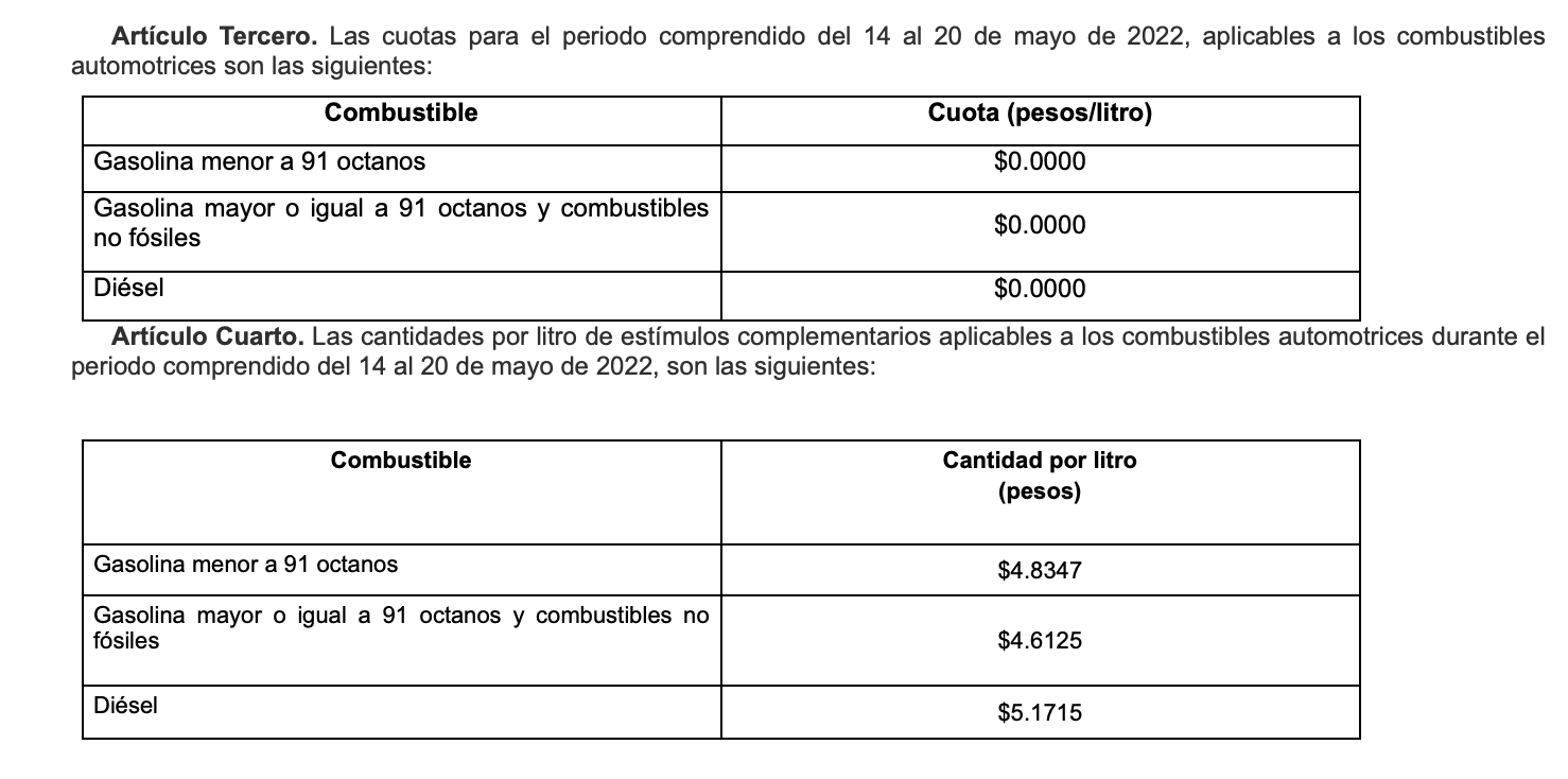Esta semana no se cobrará ninguna cuota para las gasolinas. Foto: Captura de pantalla Diario Oficial de la Federación.