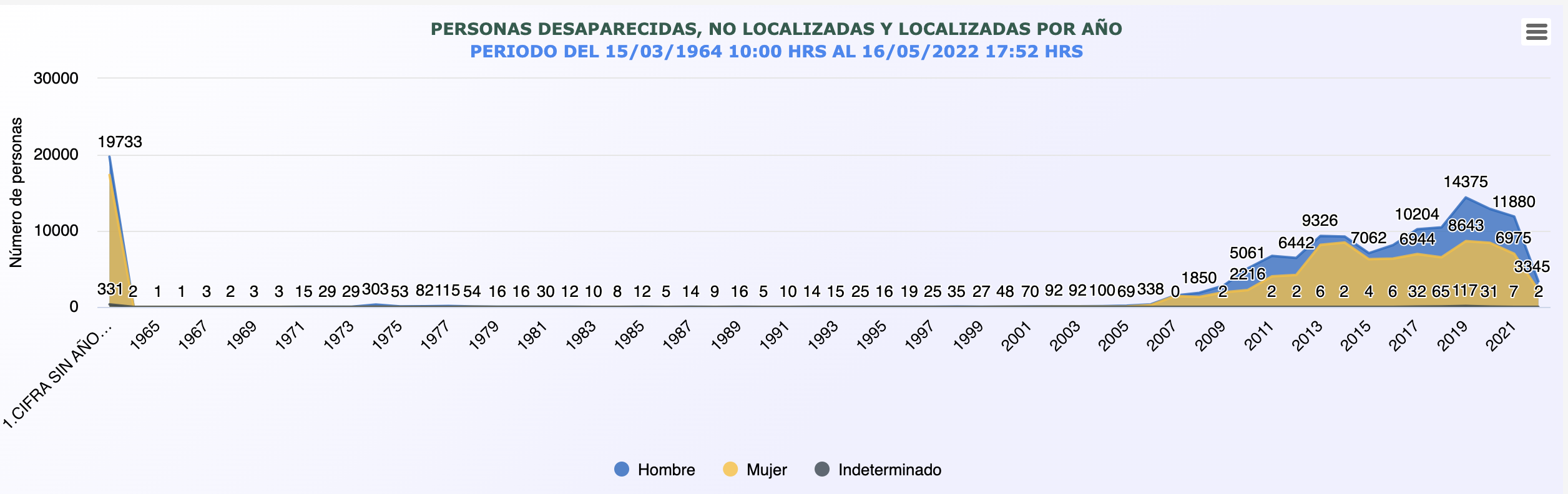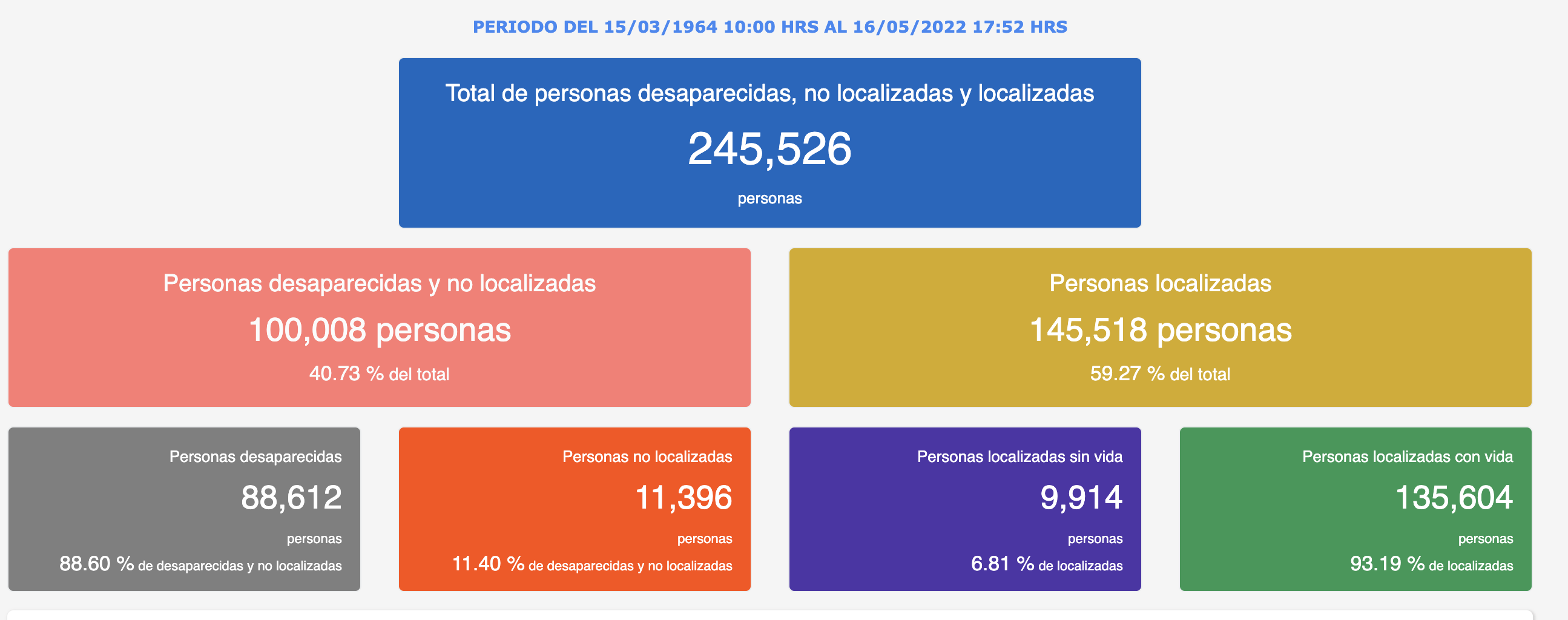 De acuerdo con el conteo oficial de la Comisión Nacional de Búsqueda (CNB) de la Secretaría de Gobernación (Segob), México acumula Personas desaparecidas y no localizadas 100,008 personas desaparecidas y no localizadas desde 1964 y con corte a las 17:52 horas de este 16 de mayo de 2022.