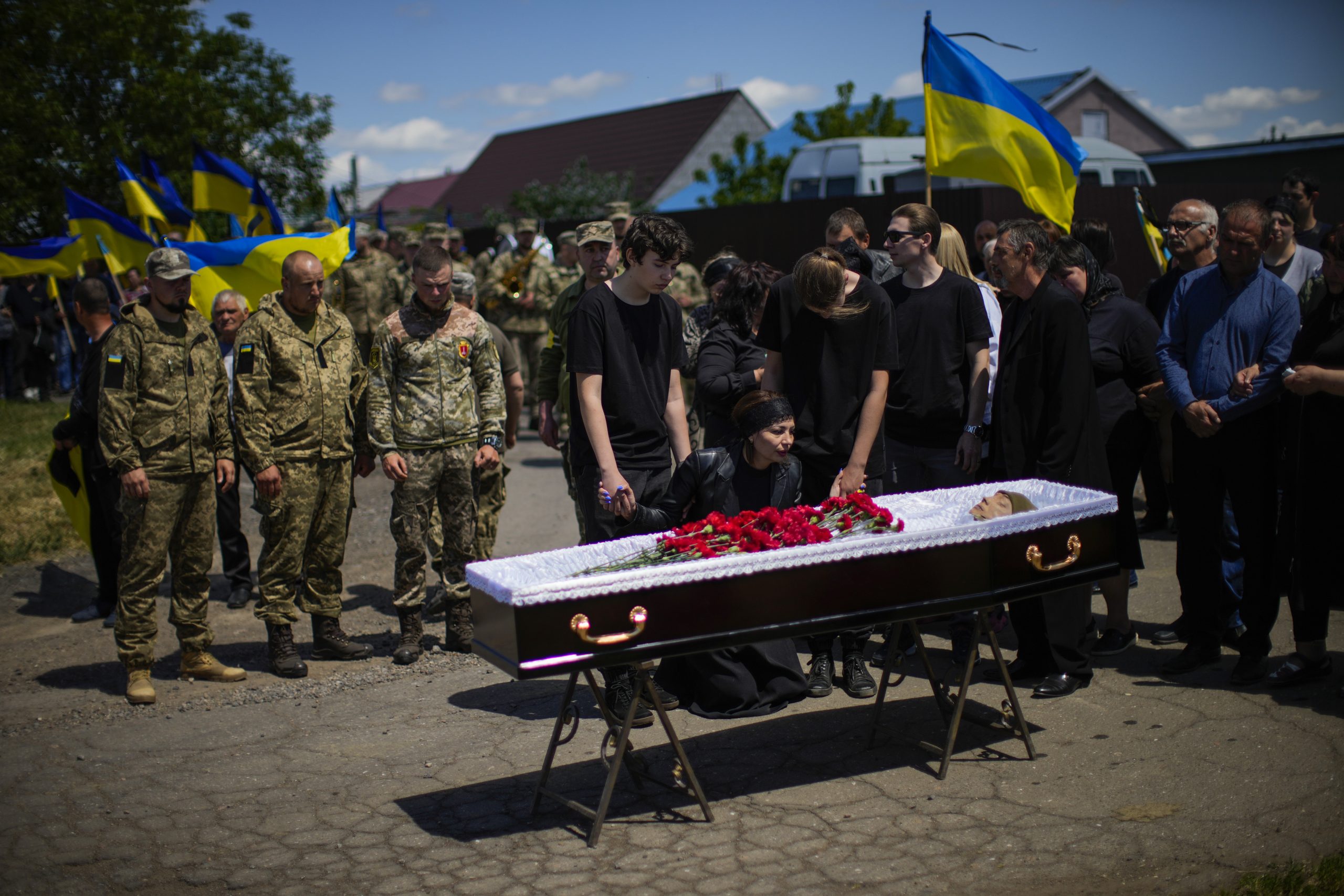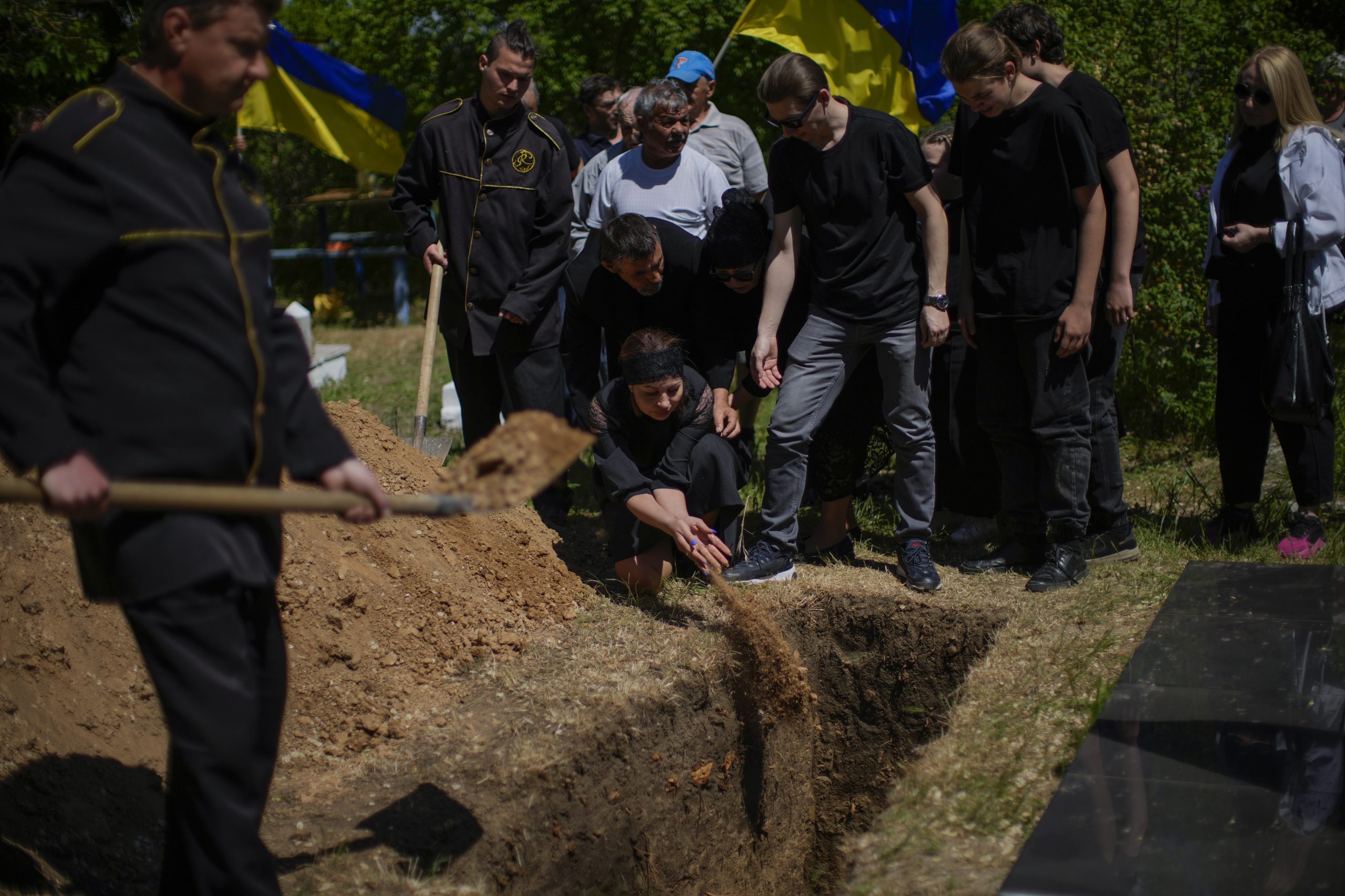 El 16 de mayo, Iuliia, con las uñas pintadas alternativamente de azul y amarillo, los colores de la bandera ucraniana, esperaba fuera de su casa mientras la camioneta fúnebre llegaba con el féretro. Los dolientes se alinearon a su paso, arrodillándose en señal de respeto.