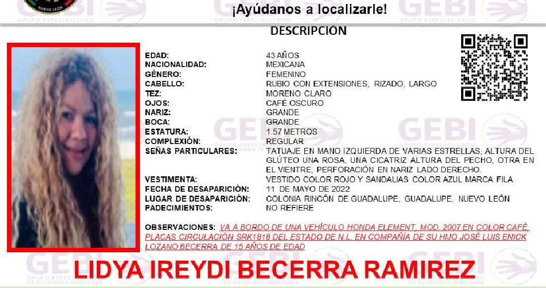 El Grupo Especializado en Búsqueda Inmediata de la Fiscalía local emitió reportes de búsqueda de Lidya Ireydi Becerra Ramírez, de 43 años; y José Luis Enick Lozano Becerra, su hijo de 15 años; ambos se transportaban en una camioneta Honda Element 2007 color café con placas de circulación SRK1818 la última vez que fueron vistos el pasado 11 de mayo.