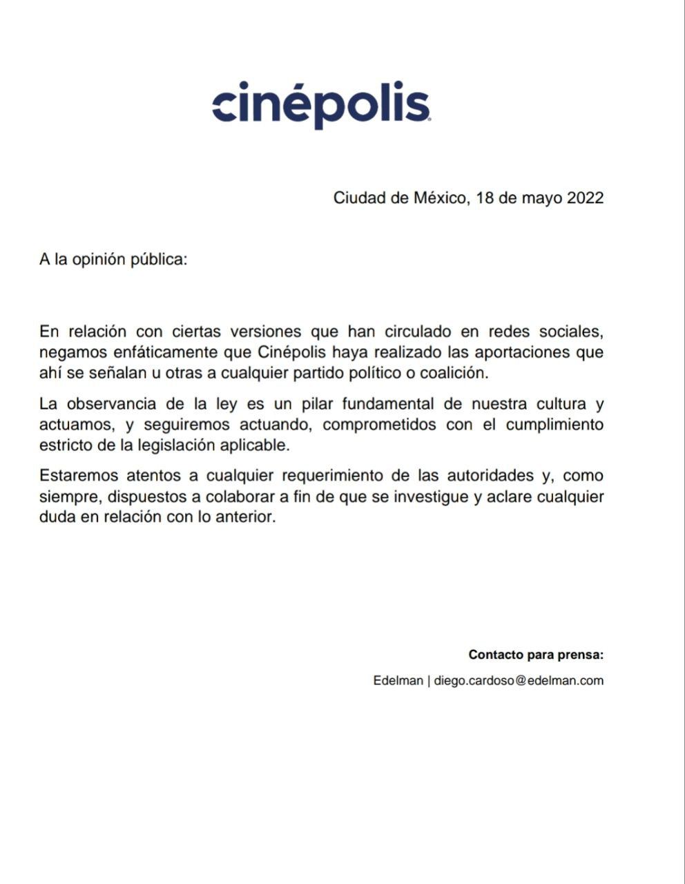 En un comunicado, la compañía negó enfáticamente que Cinépolis haya realizado aportaciones para legisladores de Michoacán, las cuales fueron señaladas por el priista en el audio, y aseguró que colaborará con el Gobierno en caso de que se le haga un requerimiento.