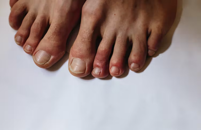 Los dedos de los pies con COVID se caracterizan por lesiones cutáneas rojas, hinchadas o con ampollas. Foto: Ternavskaia Olga Alibec/Shutterstock vía The Conversation