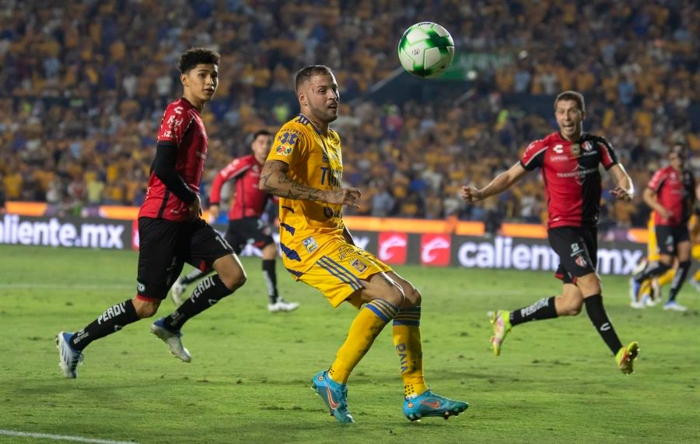Nicolás López (c) de Tigres de la UANL disputa el balón con Angel Márquez (i) de Atlas de Guadalajara durante el partido de vuelta correspondiente a la semifinal del Torneo Clausura 2022. Foto: Miguel Sierra, Cuartoscuro.