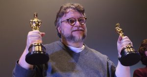 El director mexicano, Guillermo del Toro, sostiene sus Premios Oscar a Mejor Director y Mejor Película en el marco del 33 Festival Internacional de Cine de Guadalajara (FICG33), en Guadalajara. Foto: Xinhua