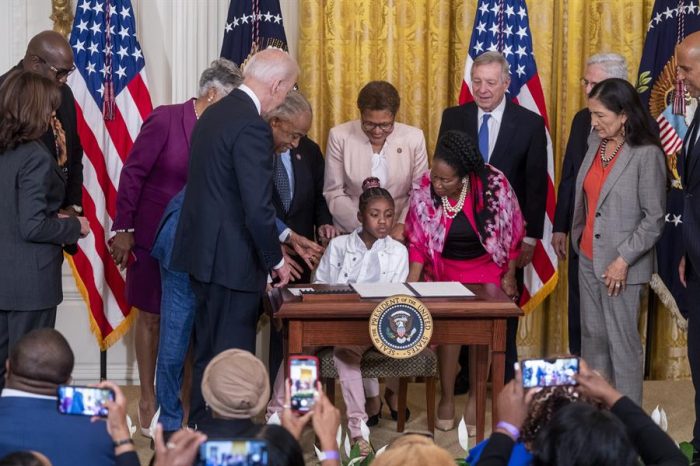 Durante la firma estuvieron presentes familiares de George Floyd, quien murió hace justo dos años asfixiado por el agente que le arrestaba, y de Breonna Taylor, quien falleció por disparos de la Policía durante una redada en su casa en marzo de 2020.