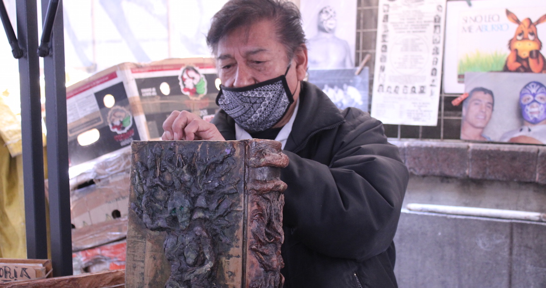 Viste una chamarra negra, abrigadora, y el cubrebocas de rombos grises oculta su sonrisa. Él es uno de los libreros más longevos: calcula que lleva más de veinte años ininterrumpidos aquí. Su puesto es uno de los más llamativos, debido a que sus creaciones, en primera fila, obligan a los transeúntes a detenerse de forma abrupta, como quien descubre un túnel en medio de la nada y se planta en el umbral con una mezcla de miedo y curiosidad.