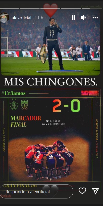 Por medio de su cuenta de Instagram, el cantante felicitó a su hijo y manifestó su emoción por verlo seguir sus pasos. También se mostró positivo por el marcador 2-0, que resultó favorable para Atlas.